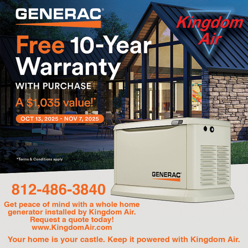 This limited-time Generac promotion is only available through Kingdom Air through November 7th, 2025. Your standby backup generator must be installed & registered by that date, so don’t delay!