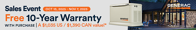 From October 13th through November 7th, 2025, when you purchase a qualifying Generac whole home standby generator, you’ll receive a FREE 10-Year Extended Parts Warranty (a $1,035 value) absolutely free!